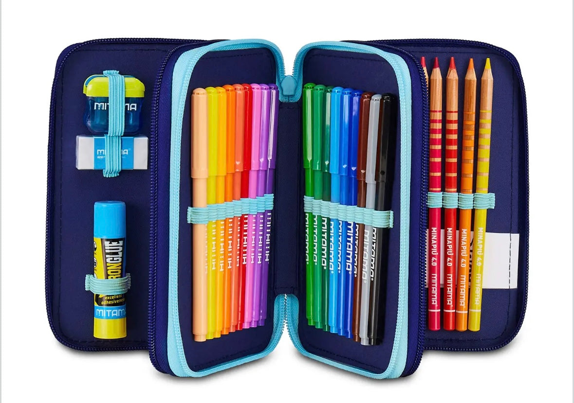 Include 44 accessori scolasticitra pastelli, pennarelli e forbici