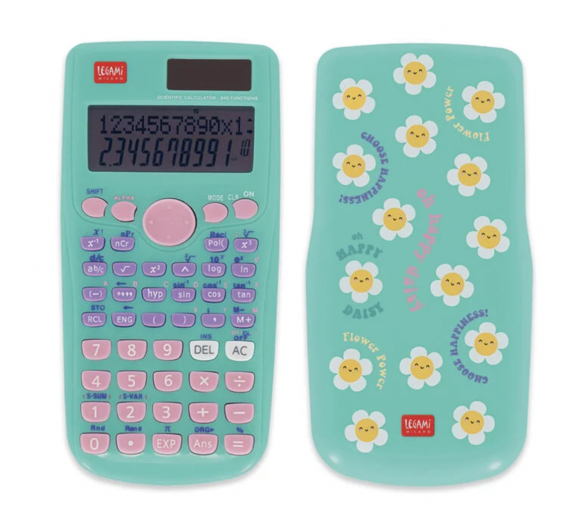 Calcolatrice scientifica a tema Genio o margherite con cover scorrevole.